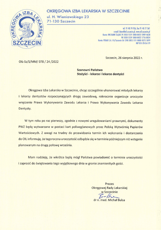 OIL Aktualności Pismo Prezesa ORL w Szczecinie ws. Uroczystego wręczenia PWZ lekarzom i lekarzom dentystom stażystom