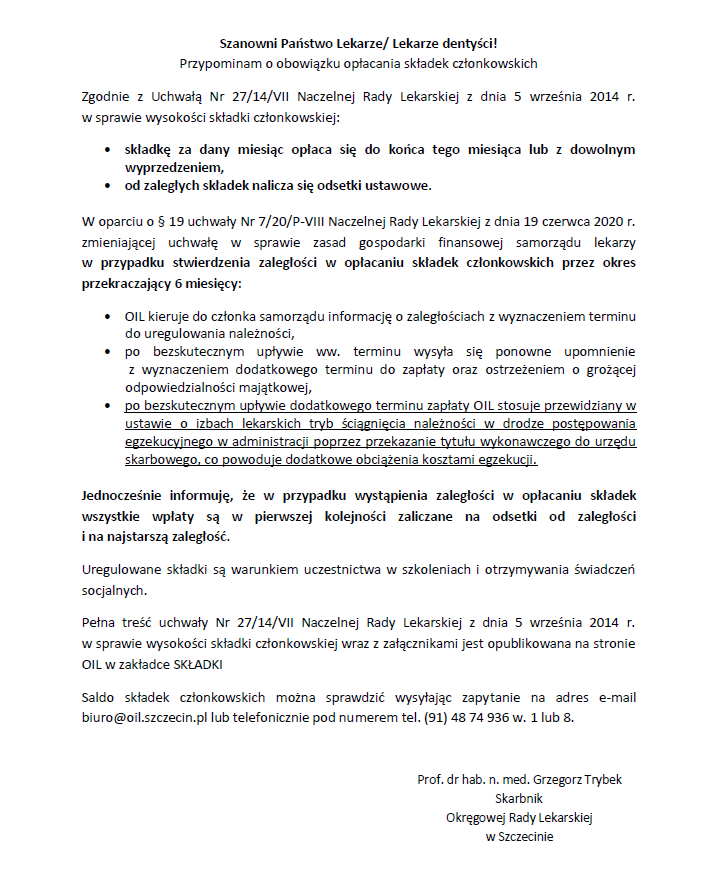 Komunikat w sprawie windykacji zaległych składek członkowskich